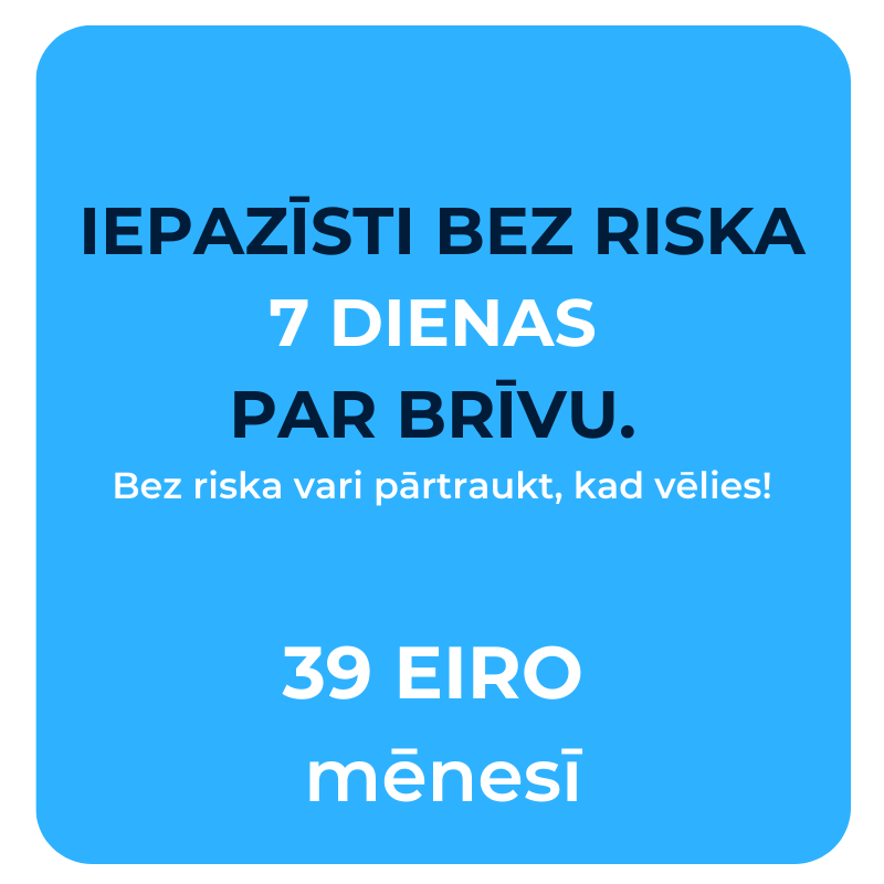 Pieteikties7 dienas bez riska par brīvu. Cenā šobrīd iekļauti arī vebināri 2x mēnesī, kas daudziem studentiem aizstāj koučinga sesijas. Viss kopā tas tikai 39 eiro - ik mēneša maksājums un bez riska atsakies, kad vēlies.